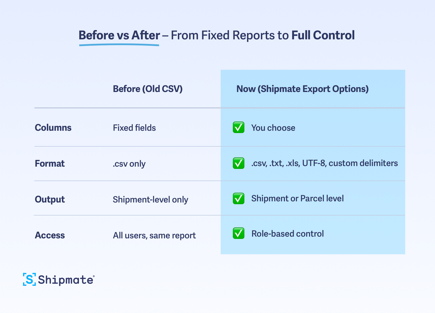 You get cleaner, more relevant data with fewer workarounds. Whether you're feeding data into ERP systems, sharing reports with partners, or running internal audits, Shipmate now fits your process, not the other way around – Your Data. Your Format. No Compromises.